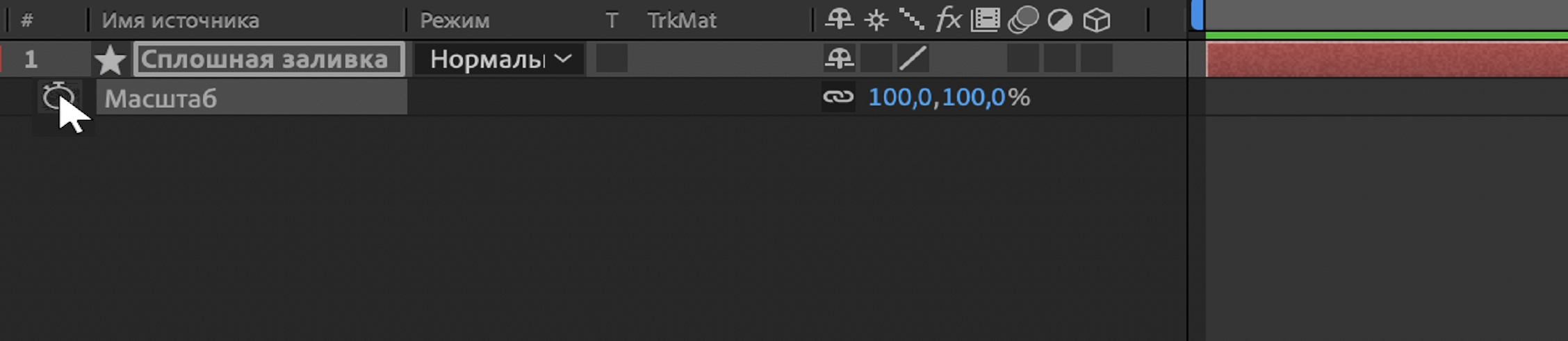 Обратите внимание на то, как изменился пользовательский интерфейс после создания выражения. Во-первых, значение свойства «Масштаб» (показано как «100,100») становится красным вместо синего. Красный цвет указывает на то, что для значения активно выражение.